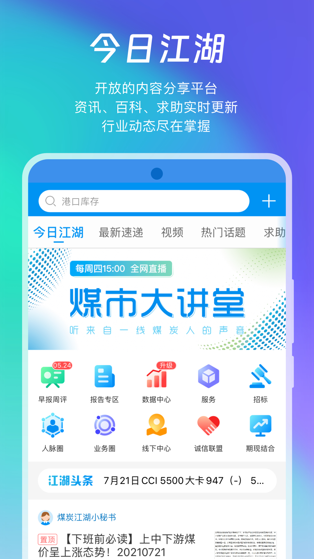 “煤炭江湖”是中国煤炭流通领域基于行业社群的煤炭供应链智慧服务平台,也是基于内容和社交服务的分享、互助式云社群。它链接行业内活跃的群体和个人,集众人智慧为众人服务,可以为会员提供全面、真实、及时的知识、信息、经验和业务机会;并透过内容实现人与人的交互,持续产生和沉淀高质量的业务数据和煤炭人行为数据,形成社群生态;围绕社群生态,依托流量、数据和人工智能,精准匹配人(企业)与资讯、数据和业务机会,基于场景赋能,为煤炭流通相关企业提供专业的供应链服务。