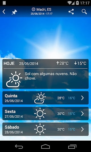 O maior e mais completo canal sobre o tempo e o clima em suas mãos! Quer saber a previsão do tempo para o final de semana na praia? Tem dúvida sobre o clima e previsão do tempo em todas as cidades do Brasil e do Mundo nos próximos 05 dias? Com o aplicativo da Climatempo você poderá saber se espera por chuva ou por sol, além de poder assistir aos vídeos, ver imagens de satélite para o Brasil e Regiões e condições dos Aeroportos e Praias . Você poderá compartilhar as notícias sobre o tempo no Brasil e no Mundo pela previsão Internacional. \\r