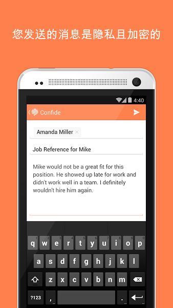 Confide 是您不留痕迹的通讯工具。我们采用端到端加密技术,消息在读取后便会消失,而且可以防止截图,为您打造真实、自然、高效的沟通体验。● 消息在读取后便*消失● 滑动以防截图● 向任何电子邮件地址或手机号码发送即时消息● 您发送的消息是隐私且加密的● 消息被读取后您会收到阅读收条● 完全免费 Confide 的背后推手是一群世界上**的早期投资者。《财富》、《福布斯》、《彭博商业周刊》、《纽约时报》、《华盛顿邮报》等权威媒体都对我们进行过深入报道。Confide 的用户已遍布全球 100 多个国家。我们所说的话一入人耳便消失了。但在网上说的话却会永远存在。我们觉得这太疯狂了。Confide。让您尽享隐秘聊天。\\r