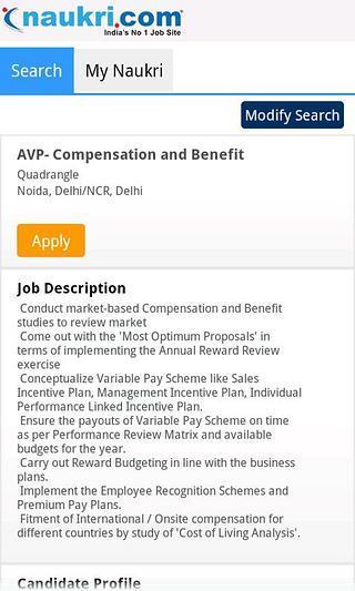 Access Naukri.com Job Search on the move Access India’s no.1 job site on the move. Naukri.com’s Job Search Application allows you to find jobs Anytime, Anywhere. Over 2 lac great jobs across various industries and functional areas are waiting for you. Good luck with your job hunt! Features: •Search for jobs easily•Apply to jobs immediately•Bookmark jobs you are interested in•Create ‘alert’ to get jobs in mail•Receive jobs of your choice on the go Note: Click on the \'Menu\' button of your device to access the entire application. Keywords:Accounts, Finance, Architect, Interior Design, Automobiles, Banking, Financial Services, BPO, KPO, Construction, Engineering, Consultants, Content, Journalism, Corporate Planning, Consulting, Engineering Design, R&D, Export, Import, Fashion, Garments, Fresher, Trainee, Healthcare, Medical, R&D, Hotels, Restaurants, HR, Administration ,IT- Hardware, Telecom, Industrial Products, Insurance, IT, Software Services, Legal Manufacturing, Marketing, Advertising, Media, Entertainment, NGO, Government, Defence, Oil, Energy, Power, Overseas, International Packaging, Pharma, Biotech, Purchase, Supply Chain, Retail, Sales, BD, Secretary, Front Office, Site Engineering, Teaching, Education, Telecom, Top Management, Travel, Airlines, TV, Films, Walk-in Interviews ,Web, Graphic Design, Manager, Senior, Engineer, Executive, Vice President, Director, Software Developer, Programming, Design, Team Lead, Graphic, Web Designer, Tech Architect, Product Manager, Voice Associate, Retail Sales, System Administrator, Financial Analyst, Audit, Delhi, Mumbai, Bengaluru/Bangalore, Chennai, Chandigarh, Hyderabad, Pune, Kolkata, Gurgaon, Noida