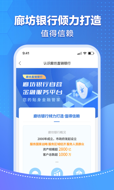 详情描述:廊坊直销银行是廊坊银行打造的线上金融服务平台,致力于为互联网客户提供简便、专属、有趣的存款、理财、贷款及权益服务。