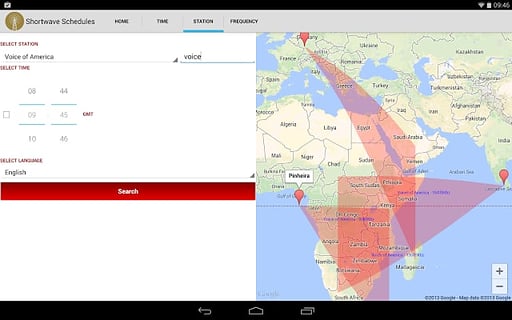 数据库搜索结果会显示电台名称, 广播起止时间, 目标广播区域(欧洲,亚洲,非洲,北美等等..), 并给出发射台址及频率(在屏幕上左右滑动可以看到完整的频率列表 ) \\r