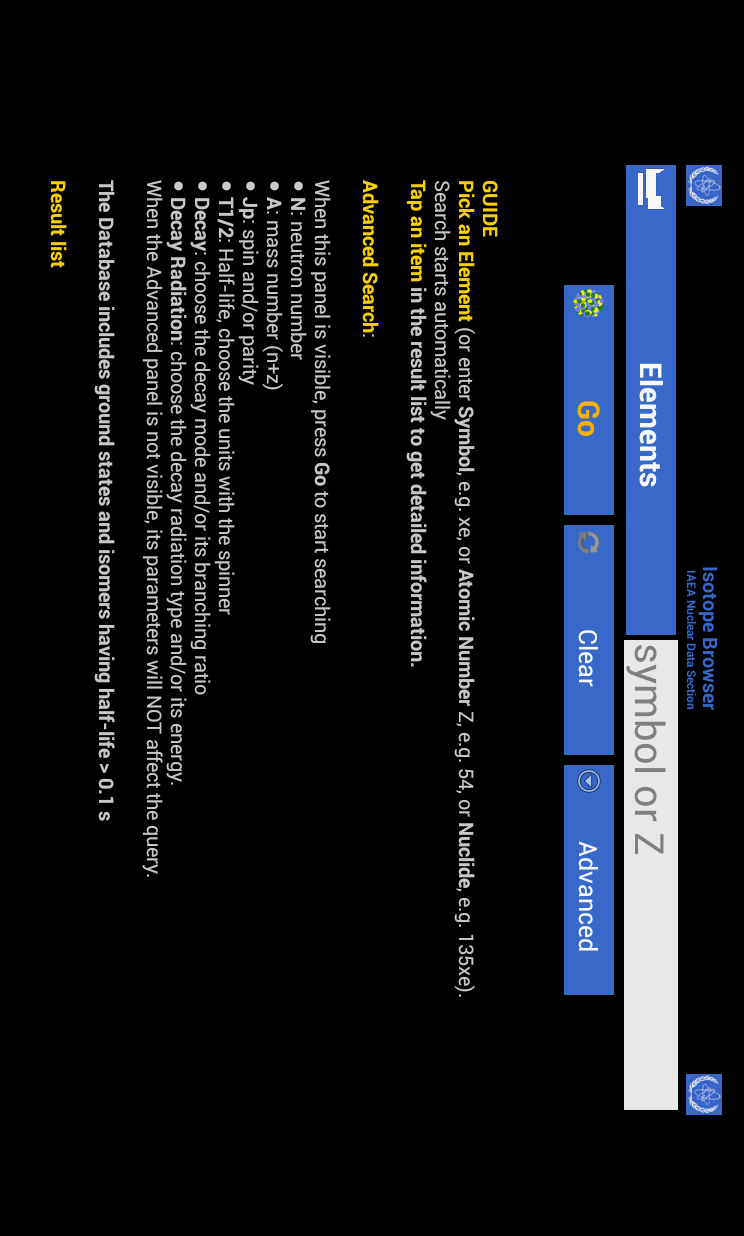 Provided by the Nuclear Data Section of the International Atomic Energy Agency, the app gives properties of more than 4 000 nuclides and isomers.A Periodic Table of Elements is included to allow easy selection, and filter criteria on half-life, decay mode, radiation type and energy can be selected.Summary data are presented in a scrolling list, with a details page for each nuclide containing web links to the data sources and further information.Data are taken from the most recent and reliable sources, and optimal search-and-retrieve performance is achieved with an embedded database, meaning that no network connection is required.