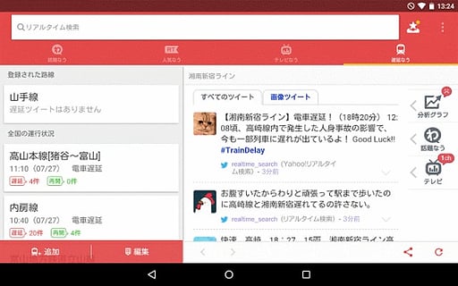 「电车遅延」や「运転见合わせ」など、运行状况にトラブルがある场合や遅延に関するツイートが急増した场合に、路线ごとの运行情报がリアルタイムに表示されます。いつも利用する路线を登录しておくと遅延情报をお知らせします。 \\r