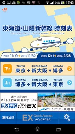【概要】 ? 海道?山陽新幹線のポケット時刻表がスマホアプリにもなりました! 時間帯ごとに列車の時刻や停車駅を閲覧できるので、新幹線の乗り継ぎ確認や列車を選ぶ際の時間の比較が簡単に。また、定期的な更新により常に最新の時刻表をお手元で確認できます。出張やご旅行の際に、ぜひご活用ください!○アプリケーションの詳細説明はこちら ? http://expy.jp/sph/useful/sphapp3/○JR? 海のホームページはこちら ? http://jr-central.co.jp/【ご利用環境】○Android OS 4.0~4.2(タブレット端末は除く) 画面解像度は以下の通りです。 ?960*540(確認機種:Xperia SX SO-05D) ?1280*720(確認機種:Xperia AX SO-01E/Xperia A SO-04E) ?1920*1080(確認機種:Xperia Z SO-02E)○Android OS 2.3(タブレット端末は除く) 画面解像度は以下の通りです。 ?800*480(確認機種:GALAXY S SC-02B) ?854*480(確認機種:Xperia arc SO-01C) ※上記を満たしていても、お持ちの端末によっては正しく動作しない可能性があります。【ご利用上の注意】※本アプリケーションは定期的に更新されますので、ご利用の際は必ず期間をご確認ください。※列車編成?時刻?番線は予告なく変更となることがあります。※時刻表において◆印のある列車は、運転日?行先にご注意ください。※小倉~博多間のみ、博多~鹿児島中央間のみ運転の列車は掲載しておりません。※ファイル容量が大きくなりました。ダウンロードの際はご注意ください。【免責事項】 ※端末のメモリ不足により正常に動作しない場合がございます。※アプリケーション内にある会員 IDの入力は、会員様ご自身の責任で入力してください。※このアプリケーションのご利用により生じた損害などは、JR? 海では一切責任を負いません。