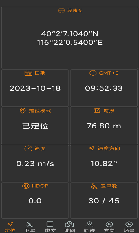 可查看手机定位模块提供的定位模式、经纬度、高度、速度、速度方向、HDOP、卫星数、卫星分布、卫星信号强度等信息;