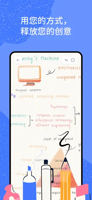 用 Notability 实现创想!免费下载,享受强大但简约的笔记体验。您很快就会明白为什么我们会荣获 Apple 编辑选择奖! \\n \\n 正如您一样,Notability 也多才多艺。记录点子,导入和标注教科书,录音,学习小测试,或者起草您的下一部杰作。不论您是学生、专业人士,还是爱好者——您都能找到所有您需要的工具。 \\n \\n 强大的电子纸 \\n• 运用多媒体工具做笔记,例如铅笔工具、高亮工具、文本和音频。 \\n• 在教科书、文稿、讲义、作业或图片上做标注。 \\n• 搜索笔记里的任何内容,包括手写内容和文稿。 \\n• 使用数学转换工具快速计算。 \\n \\n 自然地手写和画草图 \\n• 用市面上效果最逼真的矢量数字笔书写。 \\n• 墨水工具已优化,可以带来最丝滑的书写体验(兼容 Apple Pencil 和罗技 Crayon)。 \\n \\n 不用纸张,就能保持井井有条 \\n• 所有笔记集于一处!随身携带笔记,但没有重量,也没有麻烦或废纸。 \\n• 用可自定义的主题和文件夹来整理笔记。 \\n \\n 音频回放帮您不错过任何要点 \\n• 借助与笔记内容同步的录音,充分挖掘课堂和会议的内容。 \\n• 音频转录脚本中可以搜索或拷贝带有时间戳的文本。 \\n \\n 轻松演示 \\n• 支持全屏演示,不会看到分散注意力的工具栏。 \\n• 运用 Notability 的十八般工具吸引受众注意,例如激光笔。 \\n 利用多笔记功能进行多任务处理 \\n• 并排处理两个笔记。 \\n• 笔记之间可拖放手写内容、输入的文本和图片。 \\n 导入、标注和分享 \\n• 可导入和标注 PDF、DOC、PPT、图片、GIF 等等文件。 \\n• 用文稿扫描仪轻松创作可搜索的 PDF。 \\n--- \\n 在 iPad、Mac 和 iPhone 上免费下载 Notability。\\n \\n