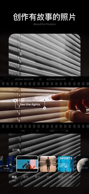 一键套用精美「海报模版」,简单操作就可以创作有故事感的照片。同时拥有海量「图文素材」,支持个性化、精准化的排版功能,轻松完成精美的海报创作。