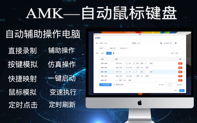 这是一款电脑辅助操作工具,帮助使用者轻松完成电脑操作,我们可以使用它录制一段电脑操作,指定启停快捷键,当使用者想要做同样的事情时,只需要按一个键即可完成这些操作,还可以更改操作速度,这样可以比录制时更快的速度操作电脑;当使用者不方便同时按多个键来完成一个操作,我们可以录制或手动添加一个或多个快捷键操作,指定一个更简单的按键,一键即可完成所有快捷键操作;我们还可以添加多个鼠标点击,这样可以帮助我们完成一些重复的点击事情,我们也可以录制一段在文本框里输入地址或其它信息,回头我们在需要输入地址的地方按一下快捷键即可自动完成输入。你可以将AMK设置为自动启动,这样 AMK 会一直陪伴着电脑使用者(打开 系统偏好设置》用户与群组》右上选择登录项》下方点“+”添加 amk.app