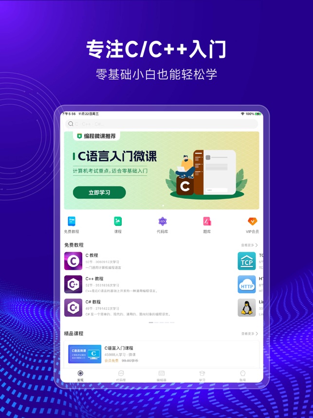 C 语言代码编译器是一款专门为零基础 C 语言编程爱好者打造的一款入门编译工具 App,致力于帮助初学者入门 C 语言,轻松迈入编程世界。学 C 语言,从这里开始!