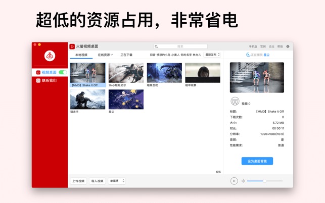 火萤视频桌面可以将任意的视频设置为你的 Mac 桌面壁纸。采用 macOS 原生开发及专为 Mac 优化的独特设计,使得系统资源占用极低,也是同类型产品中最省电的。