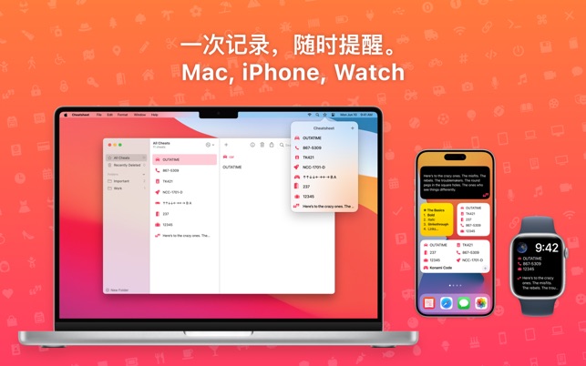 Cheatsheet 适合您从来都不记得的小事情:酒店房间号、车牌号、行李箱密码、身份证号码。将它们写在 Cheatsheet 里,然后随时可以从 iOS、Watch 和 Mac 应用中查看。