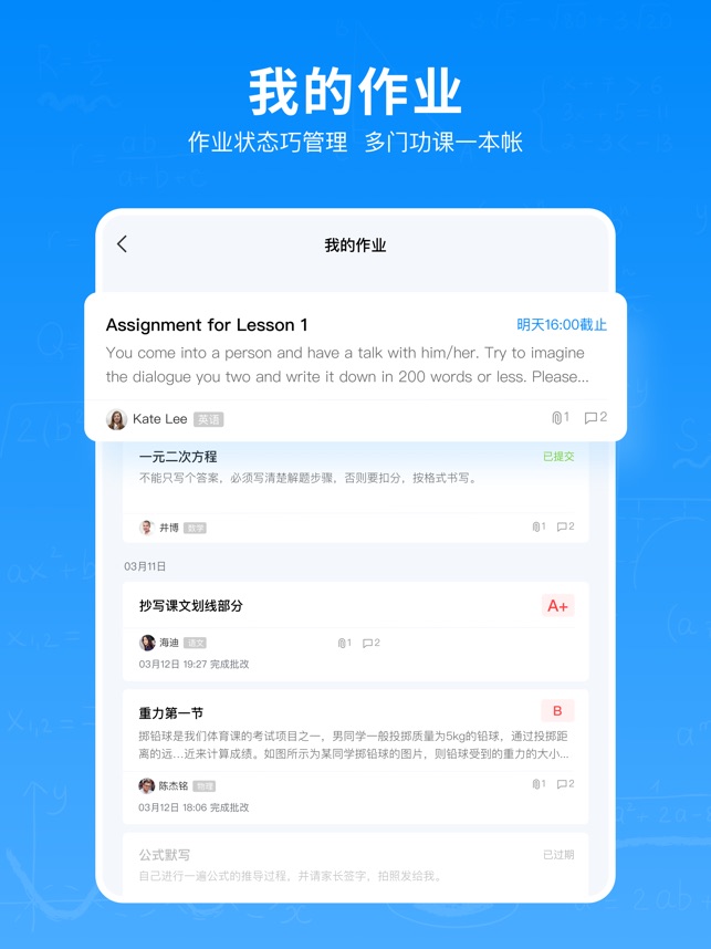 老师基于班级组织将作业发放给学生,支持上传文档、视频、音频、图片等教学资料,学生可提交图片等作为作业内容,支持老师在线打分和涂抹批阅,实时查看班级学生完成作业的情况,并提供实时批改结果反馈。
