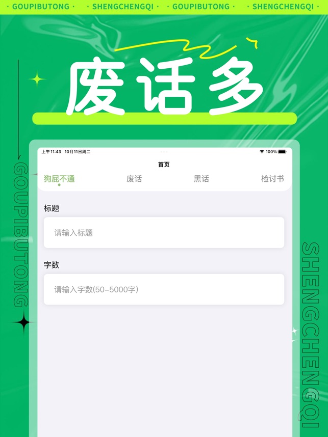 帮助用户快速生产文章,可以根据自己的需求,输入文章的关键词和字数的限定,点击生成即可看到一篇完美的文章。支持自动生成万字申请、废话报告、形式主义文章、检讨书、互联网黑话等形式。