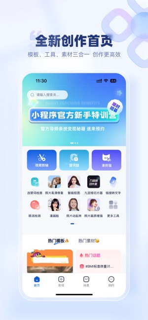 -强大的创作工具包含:文案成片、超级混剪、照片高清修复、漫画脸、老照片修复 、铅笔画制作、照片动起来、智能抠图、超清人脸修复、照片画质增强、最美证件照、九宫格、智能配音、违禁词检测、链接转文字、视频转文字、数据监控、账号检测等,一个平台满足所有创作需求,充分提升短视频创作效率。