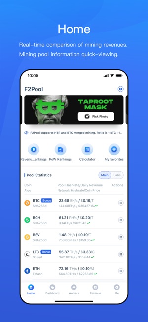 The f2pool app offers a simple way for everyone to manage their mining operation. Conveniently manage your mining machines, view your revenue, and even utilize our one-click button to switch between logged-in and anonymous mining. Miners can access every function of the website through the app, including the ability to set up custom alerts for any worker or group.