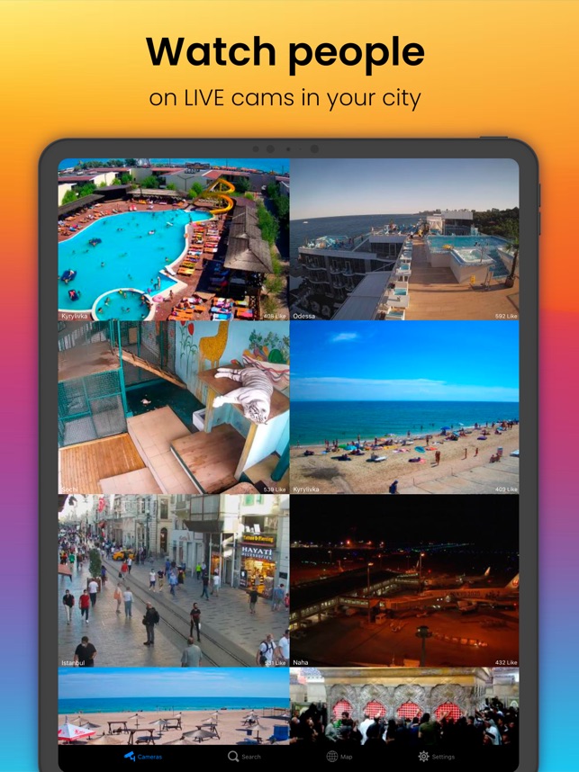 All superheroes downloaded this app to hurry up and save the world! Watch people, places, cities, countries, auto traffic, pets, animals, weather on thousands of public LIVE real time online video streaming CCTV surveillance and security web cameras around the world right from your iOS iPhone and iPad in popular Live Camera app. Watch almost every place on Earth on thousands of live IP cams in our webcam viewer (we add every Earth cam by your requests inside the app). Have a live streaming webcam video from everywhere in the world, always! Great worldview for travelers to have a spy sneak peek at travel destinations.