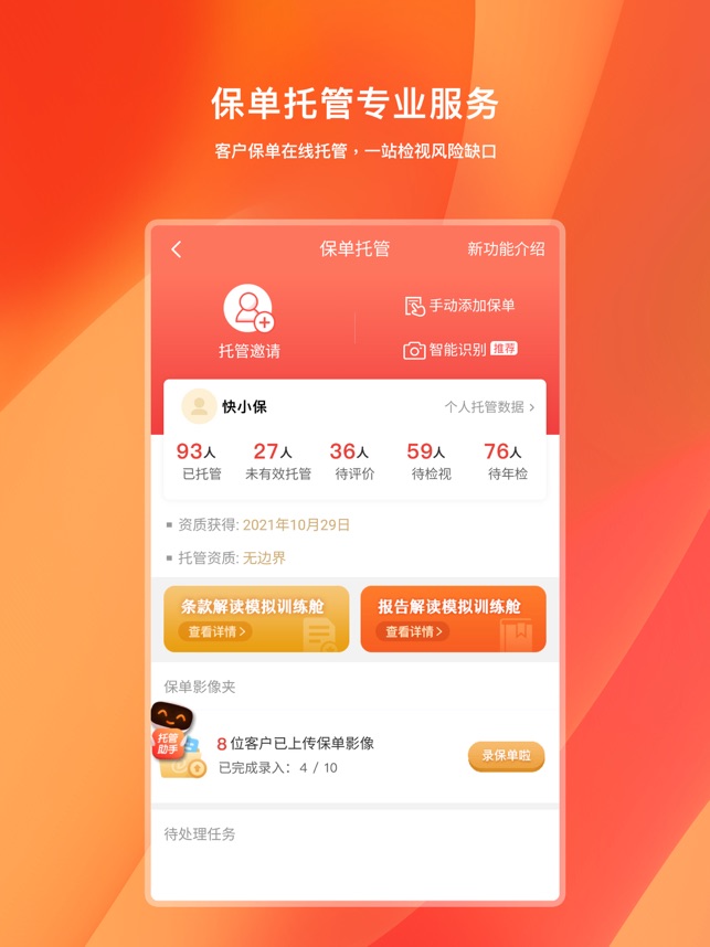快保 APP 是一款运用互联网技术,专注为保险从业者提供全方位服务支持的平台。已实现包括在线交单、团队管理、学习提升、客户管理、理赔代办等满足销售人员全周期发展的强大功能。平台链接 140 多家保险公司、上千款保险产品;原创研发的 DOSM 需求导向型、解决方案式的咨询服务模式,可实现一对一定制需求,终身帮助消费者优化风险保障方案。\\r