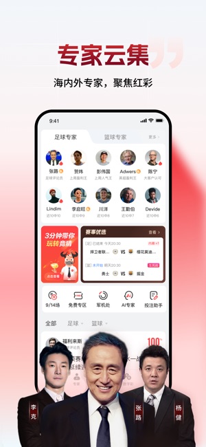 网易红彩平台进驻近百位国内外的权威专家,有张路、杨健等长期在央视一线从事足球与 NBA 的专业评论员,同时也有前国脚李金羽、徐亮、胡志军等名宿入驻。
