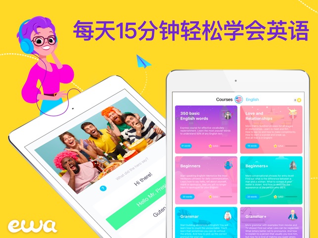不再有補習,不再有壓力,不再有憤怒的老師!通過 EWA,你可以隨時隨地按照自己的節奏學習英語。提高自己的英語水平,感受習得另一種語言的美好—獲得自由的同時,也看到高薪的工作在朝你招手。