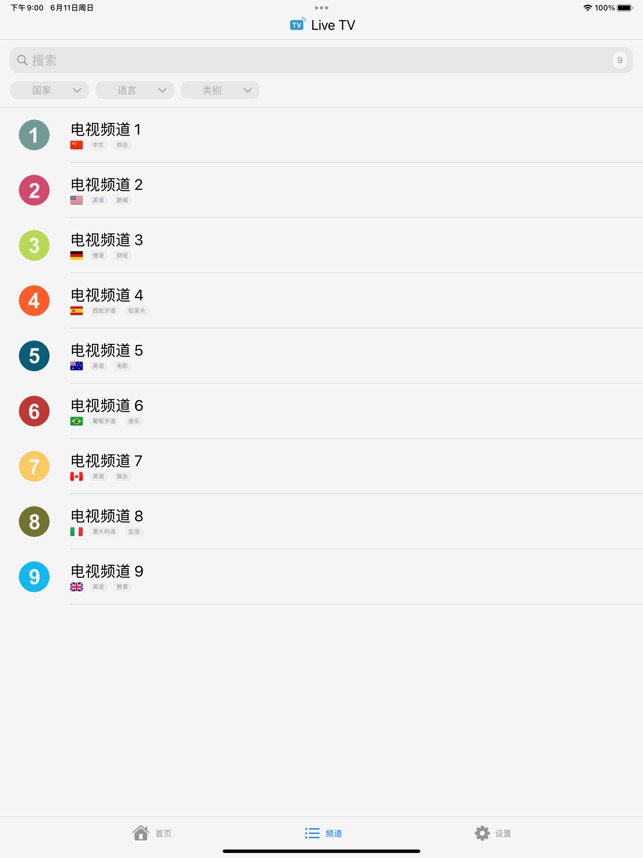 2. 频道可以按名称、语言、国家和类别进行过滤。