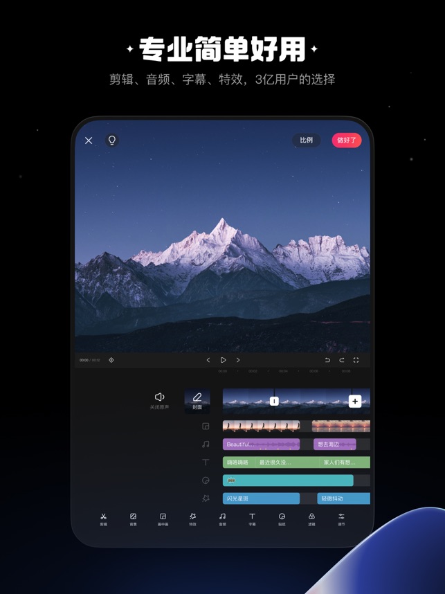 多种字幕选择和滤镜、美颜、视频背景、画中画、智能抠像等功能,让用户可以轻松制作出更加精美的视频作品。