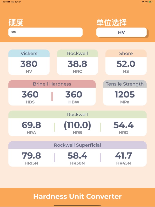 硬度单位转换器应用程序将硬度转换为 12 种类型的单位。