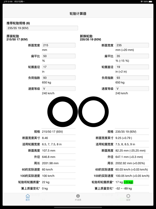 什么让本 App 从同类轮胎计算器App 里脱颖而出:估算更换轮胎和轮毂后车的簧上质量的变化!
