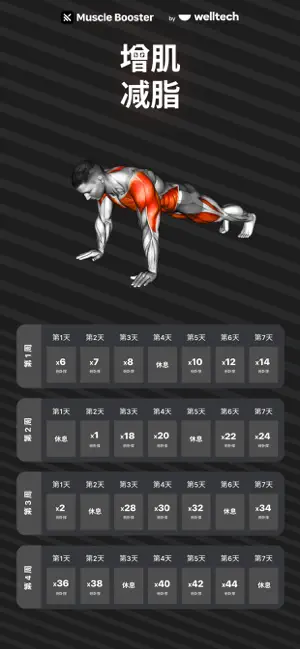 利用 MUSCLE BOOSTER 健身教练,您可以变得更好、更强、更快、更壮!\\n\\n 无论是在家进行无器械健身还是去健身房,Muscle Booster 的智能训练算法都将指导您设定合适的组次、每组次数、重复范围并确保组间休息时间,从而实现您的训练目标。\\n\\nMuscle Booster 适用人群\\nMuscle Booster 是专为注重自身健康和形体的男士而开发,这些男士追求外表和内在完美。这款应用程序可替代私人教练,无论居家锻炼还是去健身房,都能帮助您塑造完美身材。
