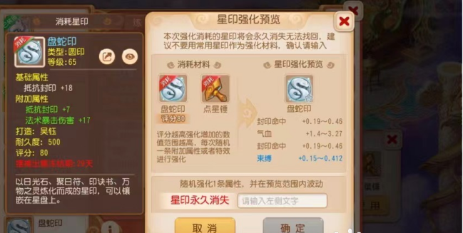 2、强化星印时慢一点确认,检查仔细。强化时会有输入文字进行确认的环节,大家一定要重视,千万不要将自己要使用的星印当素材消耗掉了!