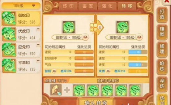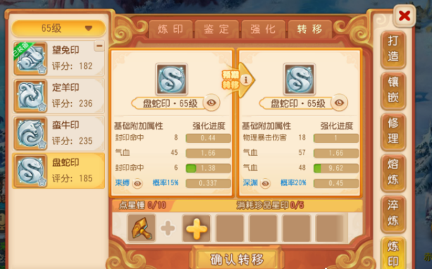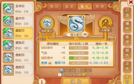 这里有几个点需要注意:首先,作为素材的星印必须是同部位、同等级的珍品星印,也就是说 65 级的蛇印只能用来强化 65 级的蛇印,105 级的虎印只能用来强化 105 级的虎印;