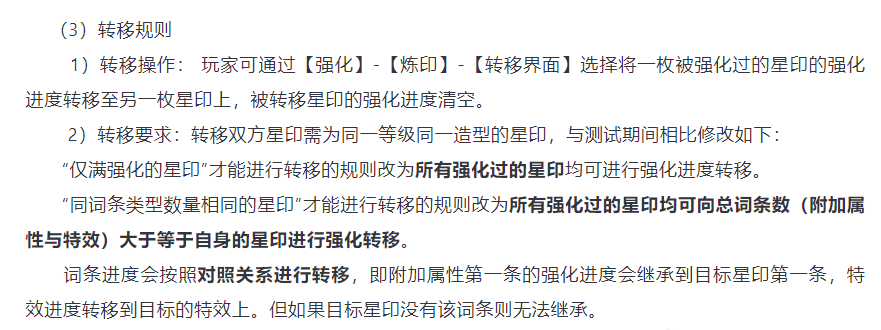例如,2 条附加属性星印的强化进度可以转移到 3 附加属性 1 特效的星印上去。转移时,第一条附加属性强化进度转移至新星印第一条附加属性上,第二条附加属性强化进度转移至新星印第二条附加属性上(一一对应的关系)。