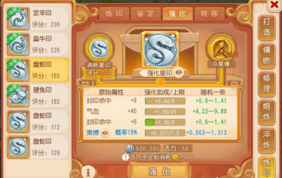 想要定向强化指定属性的话就需要用到超级点星锤——当你只剩下一条属性或特效没满的时候,可以用高分星印+超级点星锤的方式进行强化,达到“一锤定音”强化满的效果。