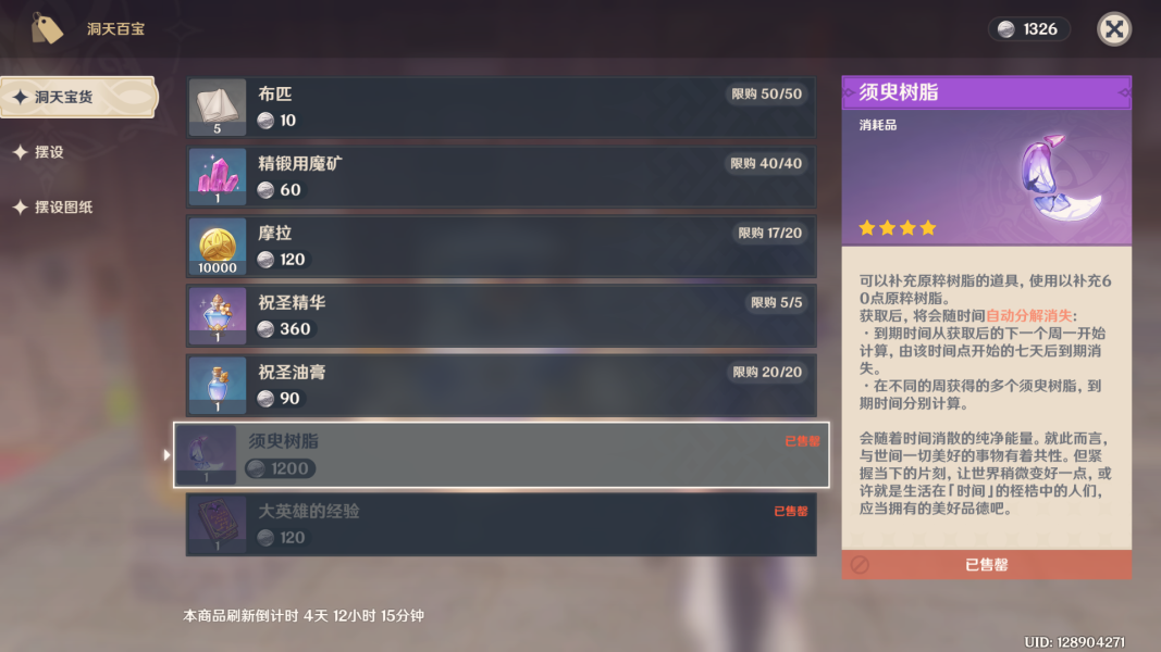 每周必买 须臾树脂,其他看自己需求。