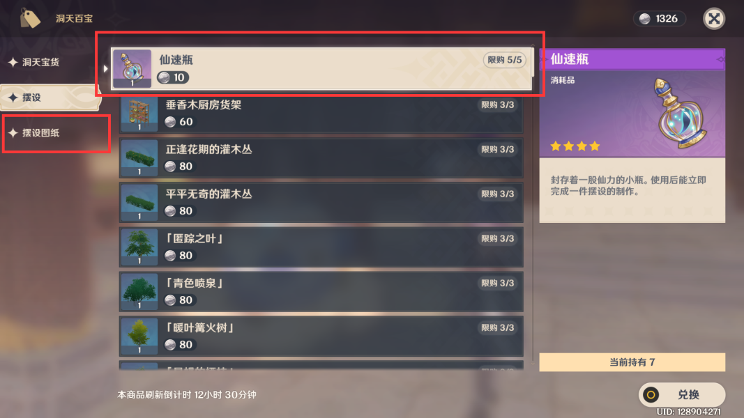 洞天宝货,前期解锁不了。摆设:每天必买 5 个,其他不买。摆设图纸:买完仙速瓶一直买图纸就行。(摩拉购买图纸的两个点,如何进他人的壶)周五,周六,周日会出现 周游壶灵但是想在其他人的壶灵买东西只能周六,周日。⑦任务