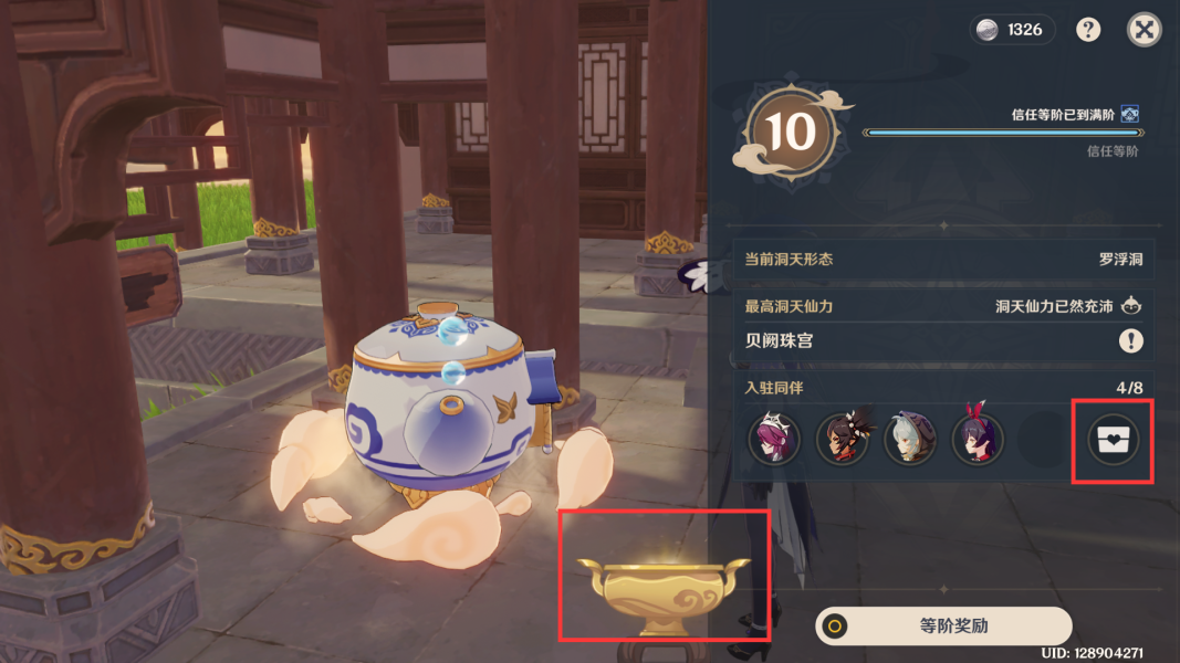 首次制作摆设,(如图)即可提高壶灵的信任等阶。注意,得到图纸,需要先在背包中点击使用。在没有新图纸时,推荐重复制作:松木折屏-「云来帆影」雕花庭院墙围 或者 雕花庭院围墙摆设后,高性价比获得仙力。⑥具体做法 与 洞天百宝