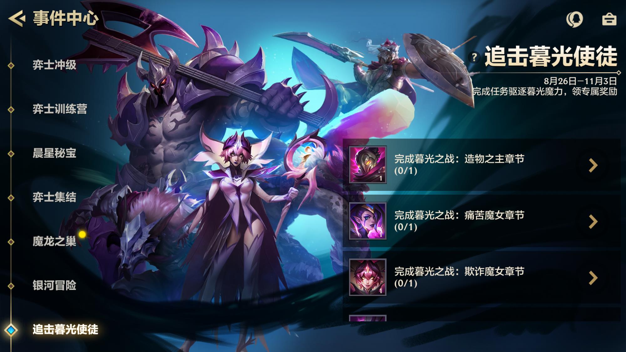 暮光之战需要在对局模式选择界面选择模式。暮光之战是闯关模式,非常考验大家的智慧。在事件中心我们能看到一共分为 8 个章节,每个章节都有相对应的挑战。