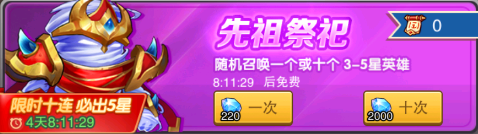3:先祖祭祀,是最重要获取五星和稀有五星英雄的方式,不论是单抽十次还是十连抽都是必出五星英雄的,在这里先不说英雄的好坏,这个我们放在后面来说。