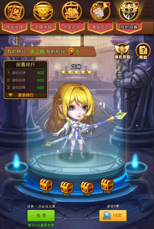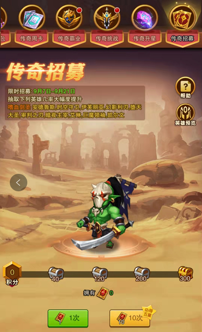 1:限时招募,每周出 1-2 次。这里 15 次必出五星英雄,乍得一看成本比先祖祭祀要高,但是他可以通过招募获取招募积分,保底出本期的稀有英雄,一般来说第一周是艾琳(四系最强奶妈),第二周出王牌地精(超强硬控),到第三周我也不清楚是谁,这里不会出现光暗英雄,只会出现四系强势英雄,包括伊芙丽亚也会出现在限时招募中。