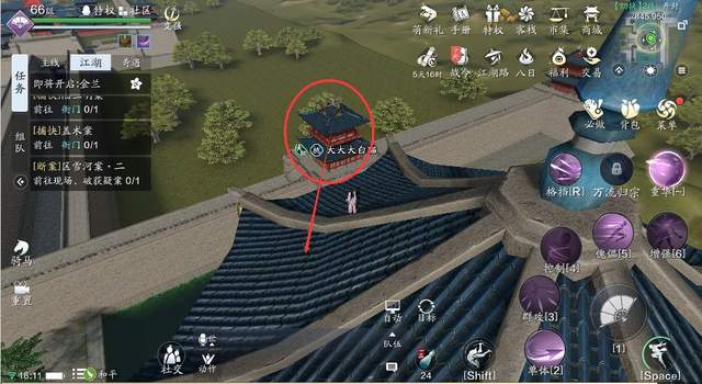 值得注意的是,此处不能自动寻路前往,需要先跳到五凤楼东北面城墙的阁楼上,再使用大轻功飞到五凤楼塔顶。