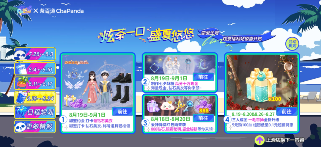 8 月 18 日至8 月 20 日期间,累计登录 2 天可得点券*666、称号-甜蜜如你群岛好礼!当日登录游戏后,可以获得3 次抽奖机会,抽完 3 抽后,30 分钟后再登录游戏,再次赠送3 抽,分享本页面活动还会获得额外 2 次抽奖机会~每次抽奖有一定概率获得钻石*888、鎏金秘钥*1(限时 3 天)、极光抽奖礼包*2、沐光礼盒*10等奖励。每日的抽奖机会不可用于下一日的抽奖,请尽快使用哦~