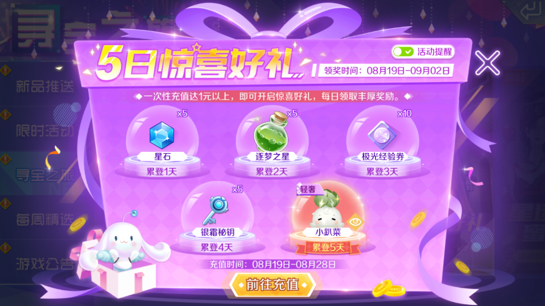 8 月 19 日至 8 月 28 日期间,一次性充值达 1 元以上,即可开启惊喜好礼,领取星石、逐梦之星、极光抽奖券、银霜秘钥、蜕变体型轻奢头饰-小趴菜 5 日惊喜好礼(注意啦,领奖时间为 8 月 19 日至 9 月 2 日)。