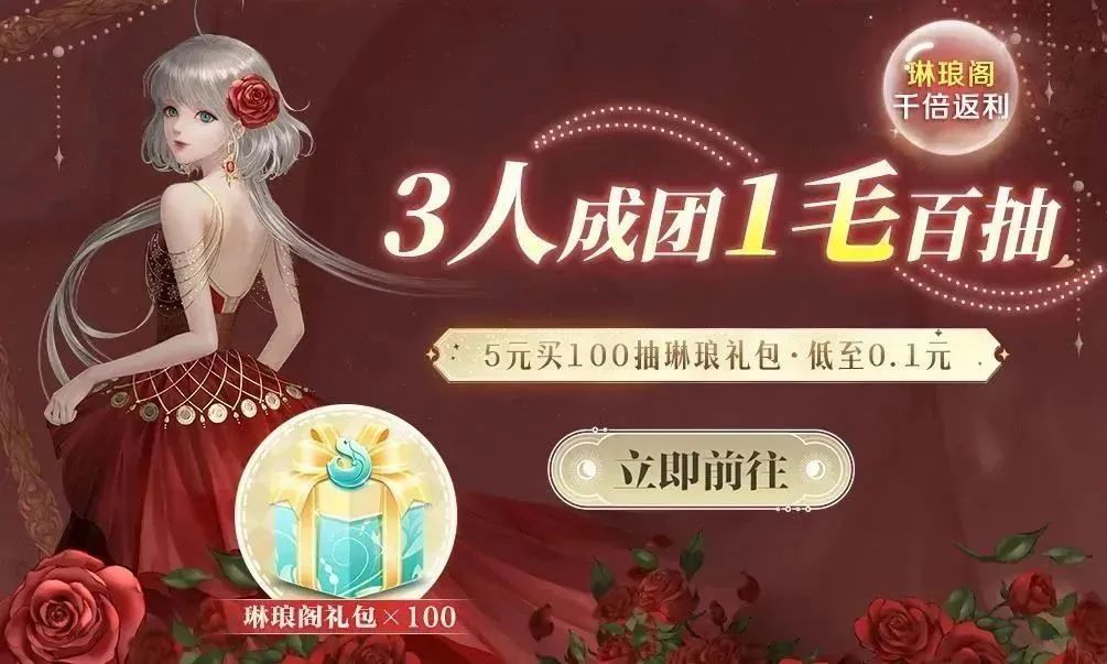 8 月 19 日至8 月 27 日期间,与 buff 玩家成团,全团均可以按照折扣价格购买琳琅礼包——5 元买 100 抽,组团低至 0.1 元!