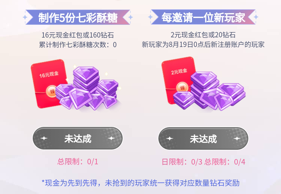 此外,累计制作 5 份七彩酥糖可得16 元现金红包,每邀请一位新玩家还可领取2 元现金奖励(16 元现金奖励将会在8 月 19 日 10:00解锁第一批,8 月 19 日 20:00再解锁第二批;新注册账号的新玩家需为 8 月 19 日 0 点之后注册,邀请新注册账号的新玩家的奖励单日限制领取 3 次,总限制领取 4 次)~