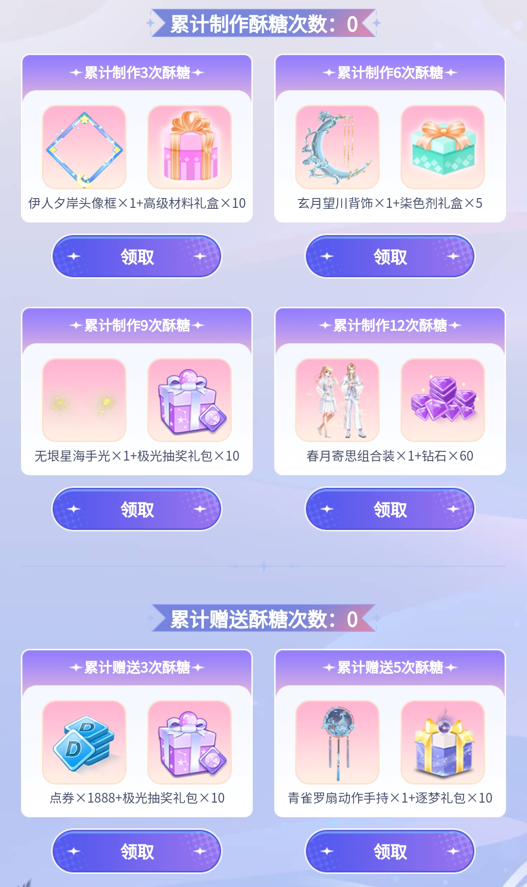 8 月 19 日至9 月 1 日期间,玩家可通过邀请结缘官/完成页面任务获得七彩酥糖/酥糖原料(符合结缘官身份条件为:2023 年 8 月 19 日 0 点后新注册账户的新玩家或 2023.8.12-2023.8.18 未登录游戏的玩家),累计制作/赠送指定次数酥糖可得伊人夕岸头像框、玄月望川背饰、无垠星海手光、春月寄思组合装、钻石*60、青雀罗扇动作手持、逐梦礼包*10等好礼。