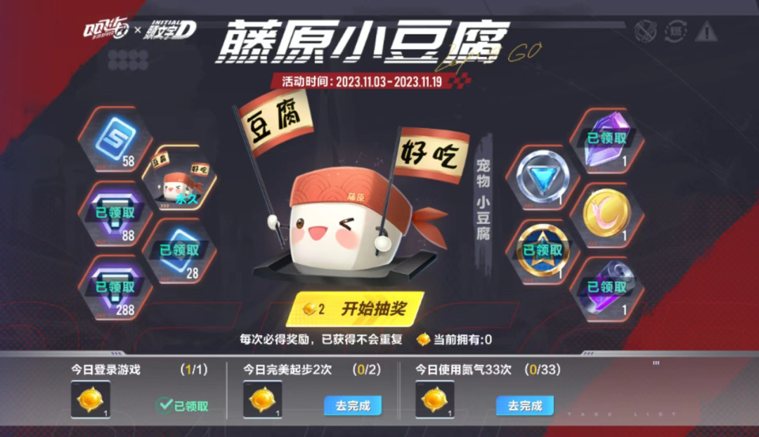 即日起-11 月 19 日,车手们登录游戏并完成指定任务,可获得豆腐碎片。消耗指定数量的豆腐碎片进行抽奖,即可获得头文字 D 联动专属宠物小豆腐以及海量道具奖励!