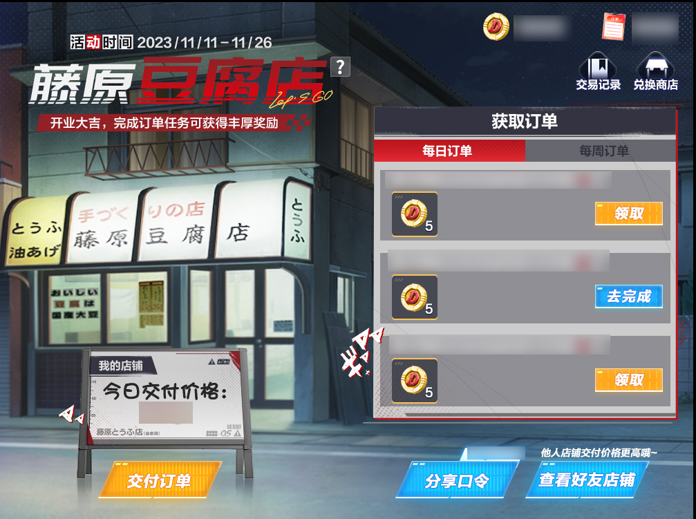 藤原豆腐店开张啦~11 月 11 日-11 月 26 日,车手们登录游戏并完成指定任务即可获取豆腐店每日订单,在自己的店铺或好友店铺交付订单可以获得金币奖励,使用金币可在兑换商店兑换海量奖励!