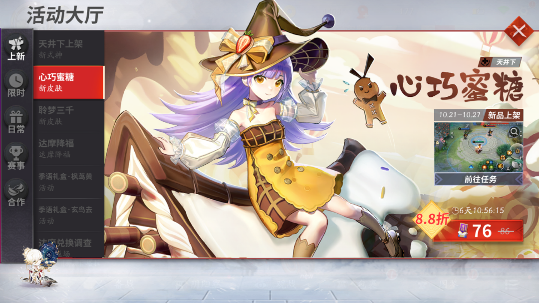 活动期间,穿戴天井下史诗皮肤「心巧蜜糖」、拥有新式神「天井下」完成指定任务,即可获得[金币福袋]、[祈福绘马]、[回城咒印幸运礼盒]、[中级澄心值礼包]等奖励!