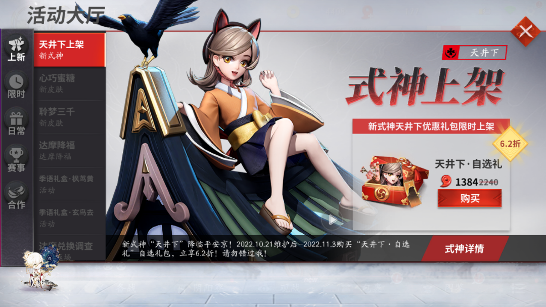 同时,[商店]-[杂货铺]将上架[天井下·自选礼]。自选礼中包含新式神[天井下]、韵彩皮肤[春社]、[觉醒幻形符]*1、[太极结印]*1、[雨晴垂枝]*8,阴阳师大人们可自行选购![天井下·自选礼]上架至 2022 年 11 月 3 日 23:59,请喜爱天井下的阴阳师们不要错过哦!