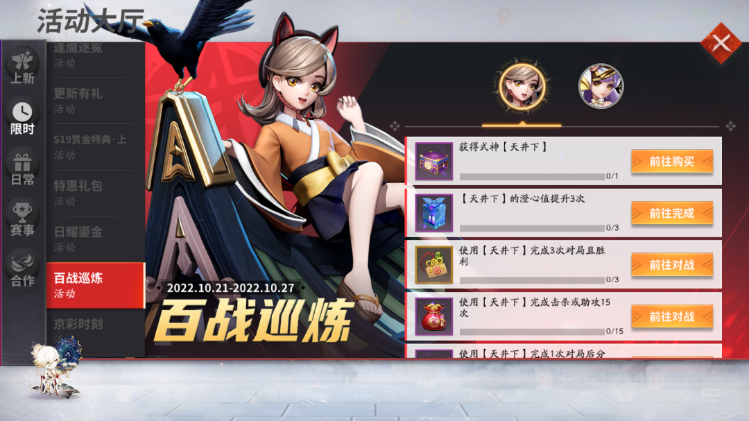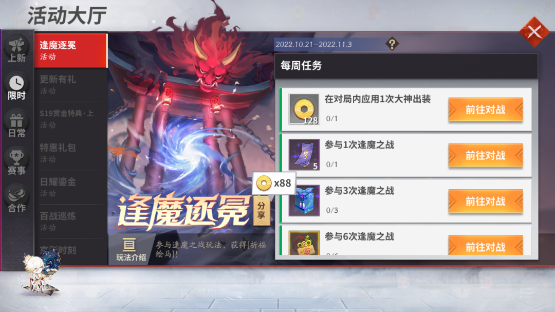 活动期间,参与逢魔之战玩法,完成指定任务即可领取[祈福绘马]等奖励,请勿错过哦!